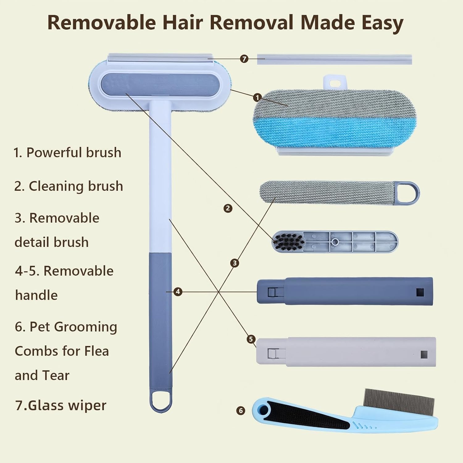 - 【4-in-1 Multifunctional Tool】 Combines pet hair removal brush, window scraper, crevice tool, and fabric-safe lint roller. Rubber scraper back removes water stains; hidden brushes clean tight spaces and clothing.