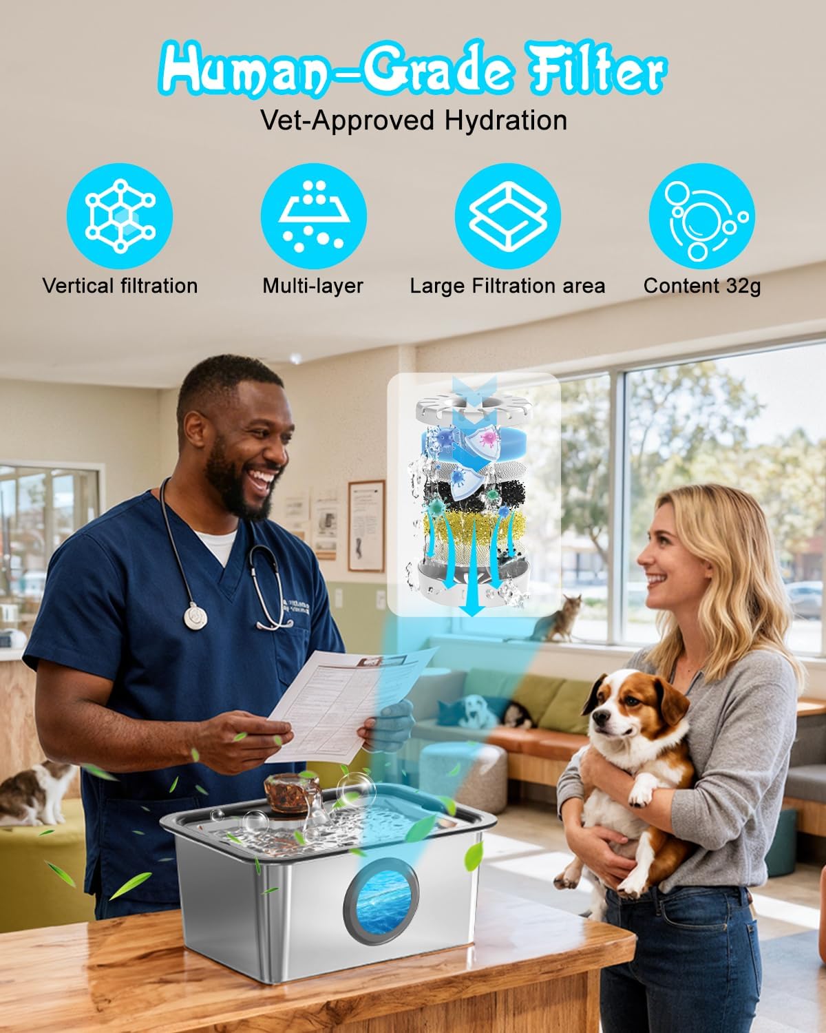 - Capacity: 3gal, Size: 13.5" * 10.6" * 7" , Material: SUS304, Replacement Filter: search asin "B0F8HKBZQF" on Amazon. Suitable for: large dogs, or multi-pet households.
