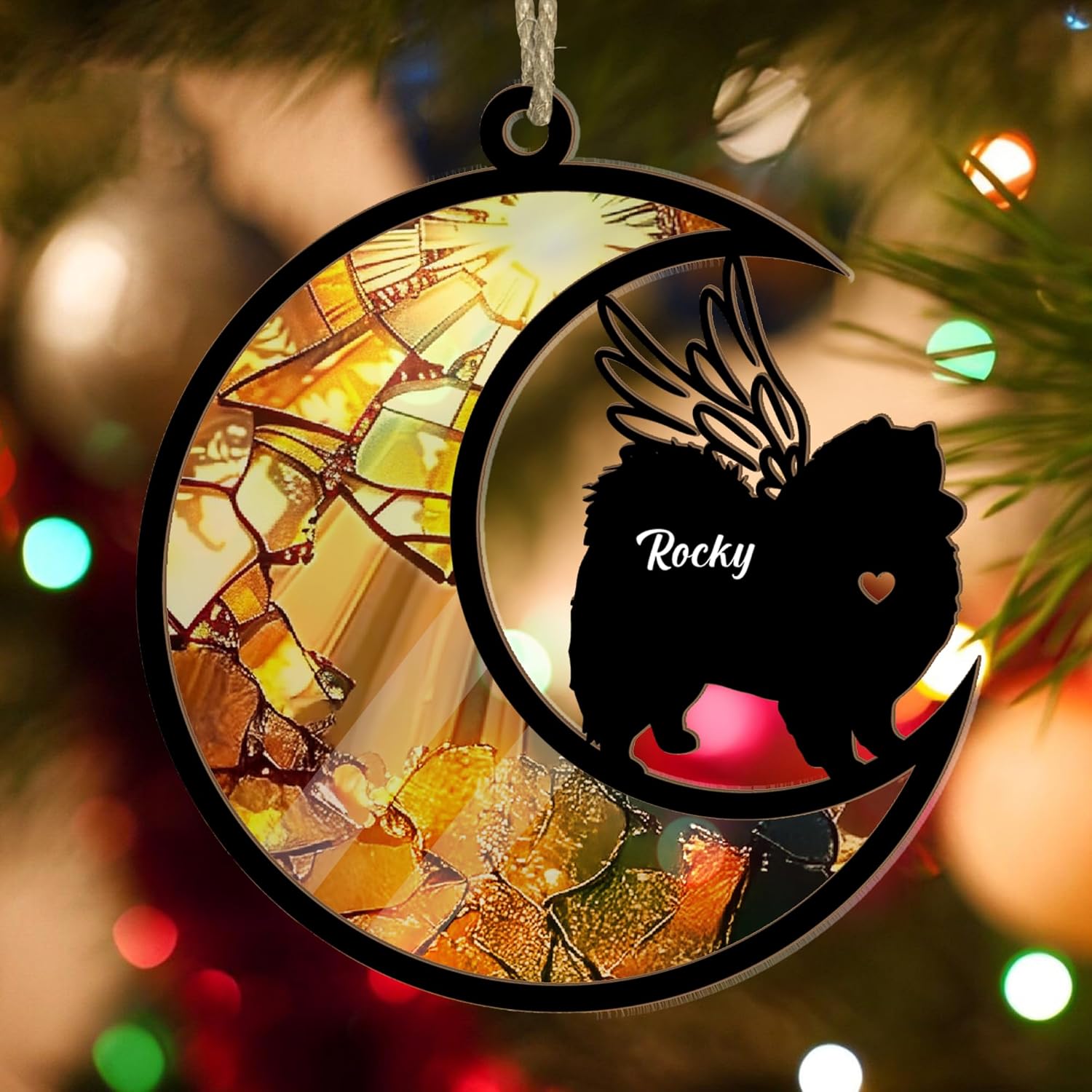 - GENTLE TRIBUTE FOR ANY PET LOST, CUSTOMIZED BY NAME This angel-wing moon suncatcher honors your beloved pet with beauty and comfort. Whether dog, cat, rabbit, or ferret, their silhouette rests on a crescent moon, complete with angel wings and their custom name engraved (e.g., “Milo”).