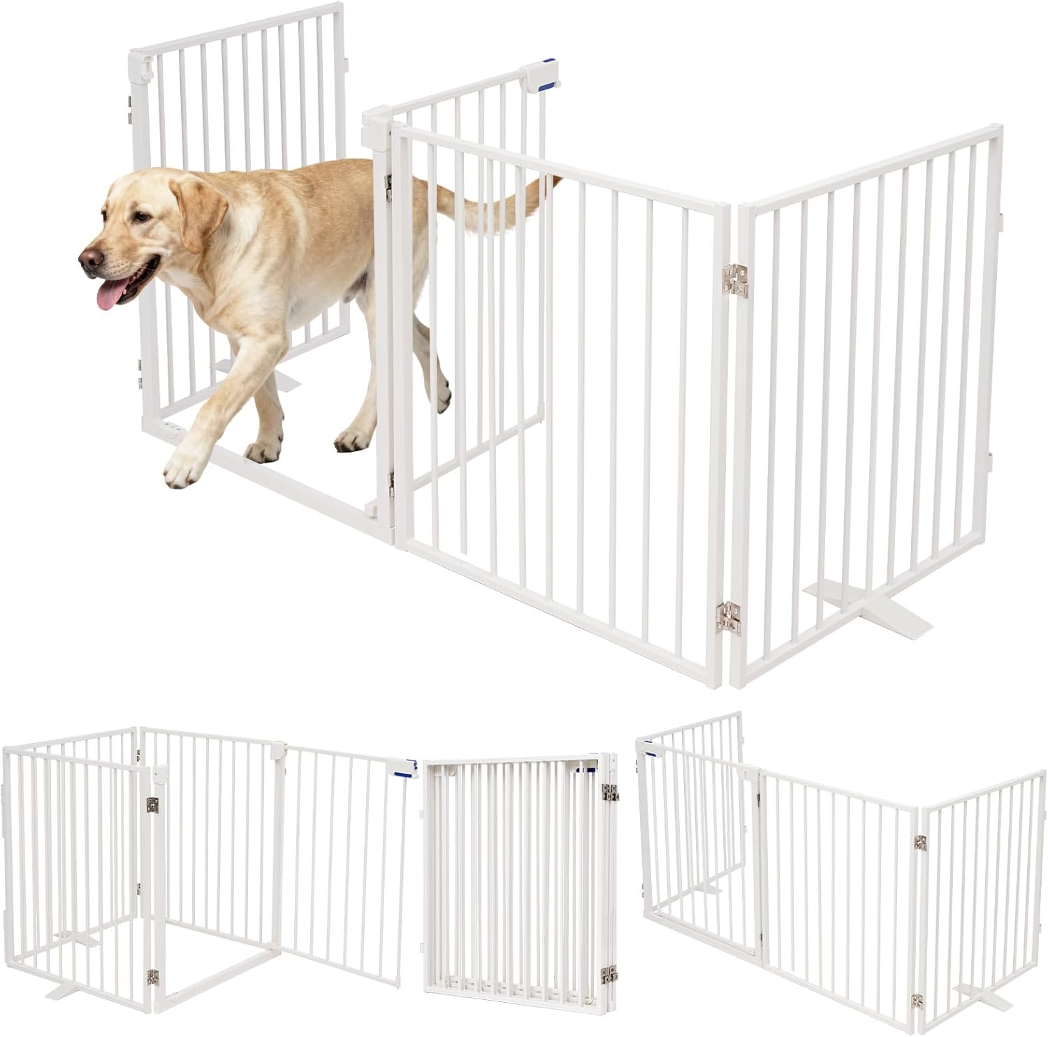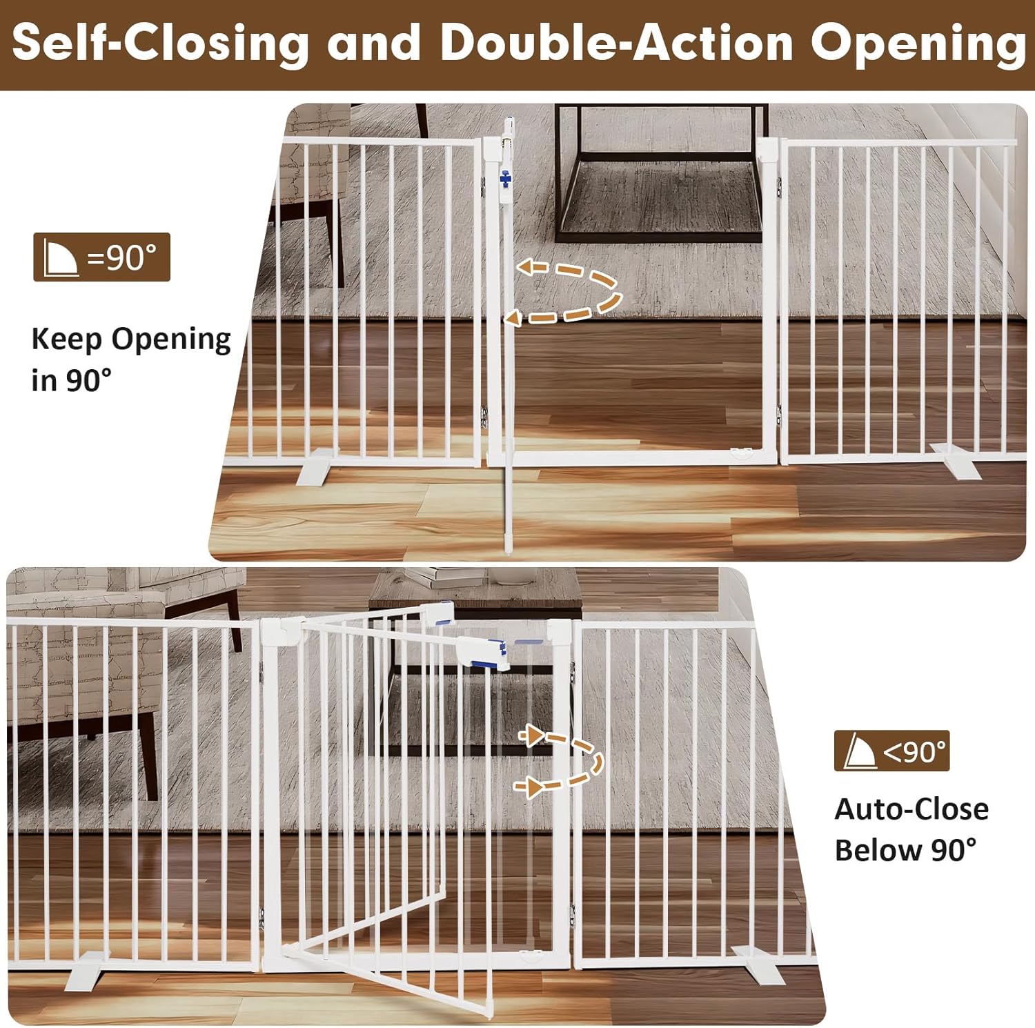 104" Dog Gate Extra Wide, Heavy Duty Metal Freestanding Dog Gate with Door for Indoor & Outdoor, Foldable Pet Fence for Doorways,House,Porch,Deck,Yard,Stairs, Auto Close(4 Panels,White)