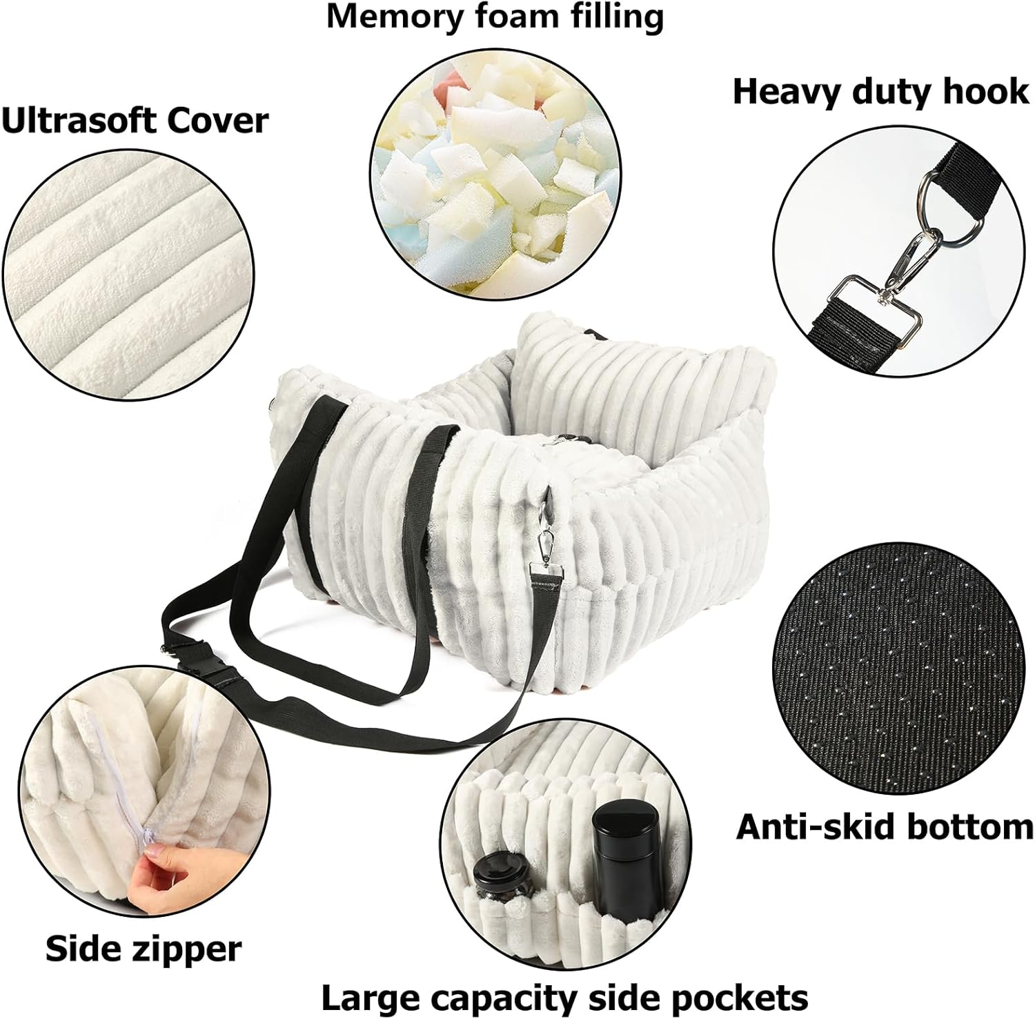 Dog Car Booster Seat, for Small Dogs Under 30 lbs, Detachable Washable Travel Bed with Storage Pockets and Safety Belt (Beige, Medium)