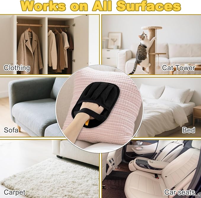 - ๐๐จ๐ซ๐ค๐ฌ ๐จ๐ง ๐๐ฅ๐ฅ ๐๐ฎ๐ซ๐๐๐๐๐ฌ๏ผThe pet hair removal tool is effective for use on most surfaces, including fabric, furniture, bedding, carpets, and even car interiors. Whether you're cleaning pet hair off your couch, clothes, or car seats, this versatile pet hair mitt handles it all with ease.