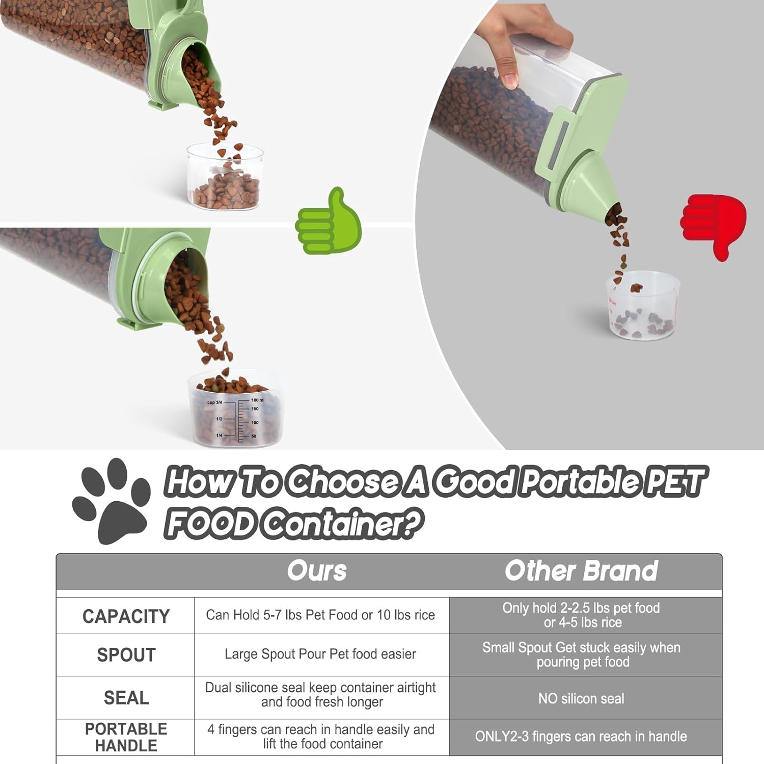 - Upgraded and Lmproved Versions:We have optimized and improved the mold the pour spout is large enough to pour out the big dog Food,You can pour out the food easy and fast now. The new upgraded Measuring Cup is also easy to screw on the spout now.The lid with snaps can also be easily closed on the barrel body.