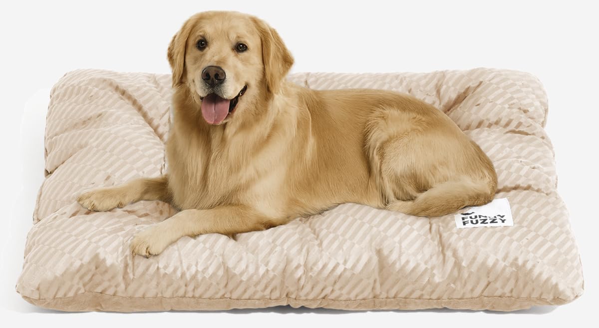 FUNNY FUZZY Washable Dog Bed,Reversible Plush Dog Crate Mat, Soft Fluffy Kennel Pad,Pet Sleeping Mattress for Jumbo,X-Large Sized Dogs Breeds,2XL,48"× 31",Beige