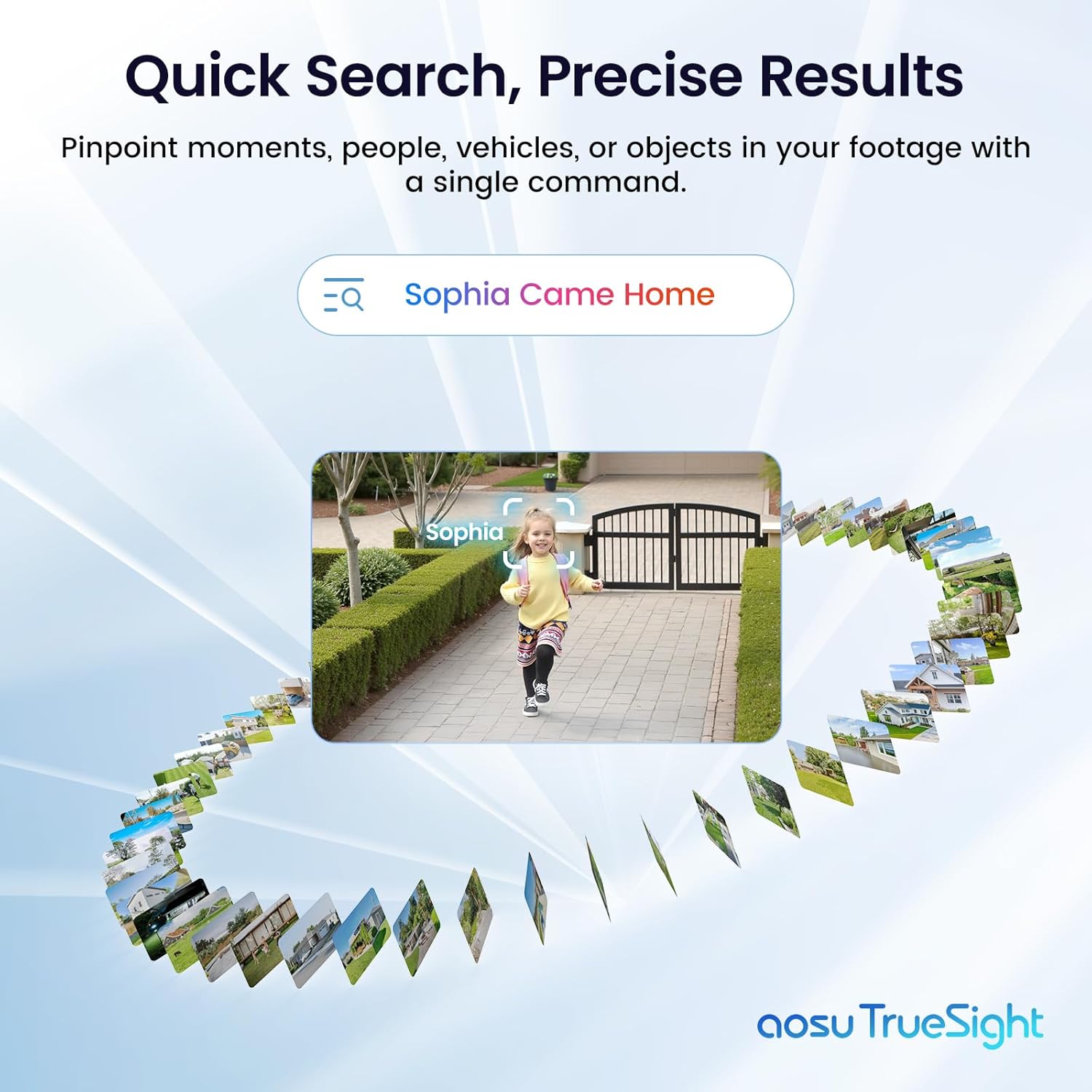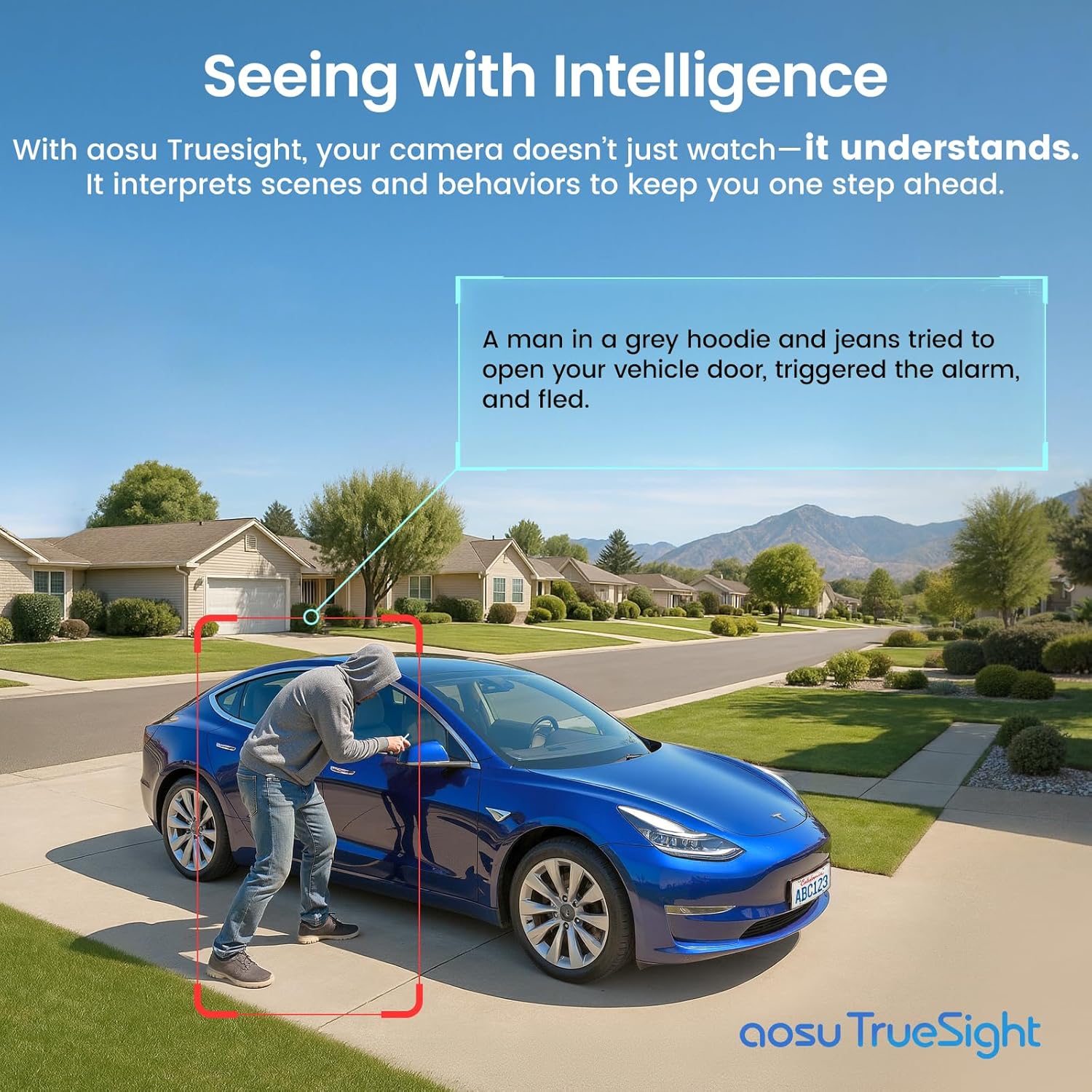 - aosu TrueSight — When Your Camera Truly Understands: TrueSight AI combines face recognition and behavior analysis to detect strangers—even in disguise—and recognize both familiar and unfamiliar vehicles. Suspicious behavior triggers instant alerts, while footage is AI-organized for quick, one-command searches—keeping you proactive and your home safer.