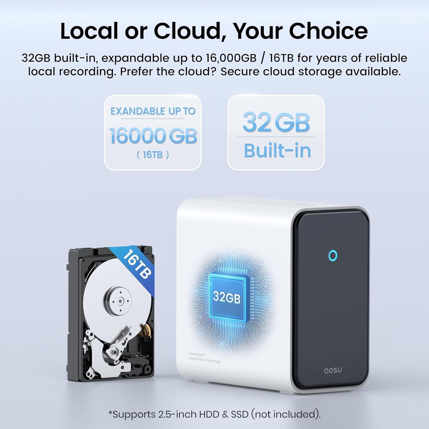- Built-in Local Storage — Secure & Expandable: aosu features 32GB of built-in storage (expandable up to 16TB), keeping your recordings private, encrypted, and fully under your control.