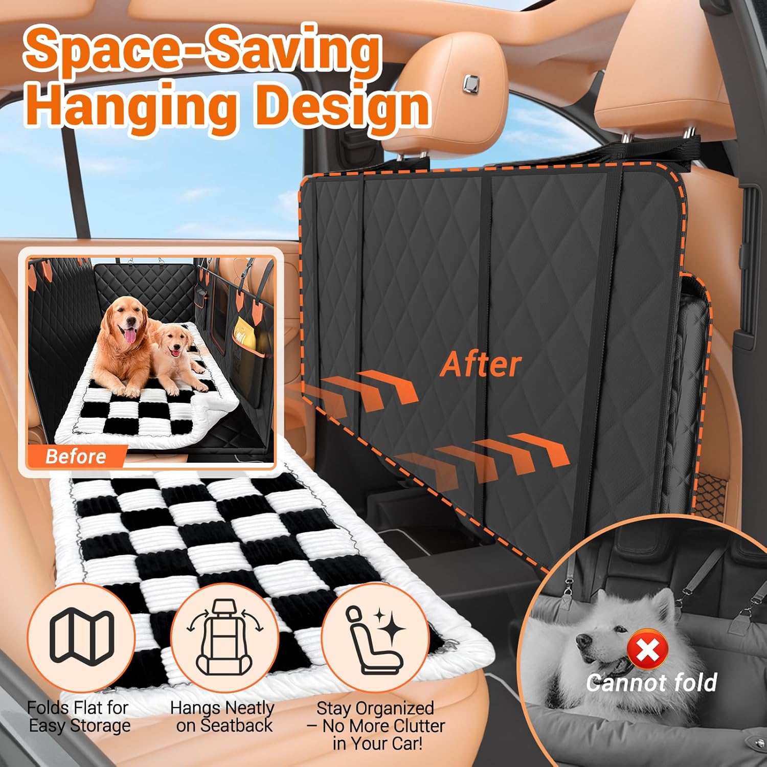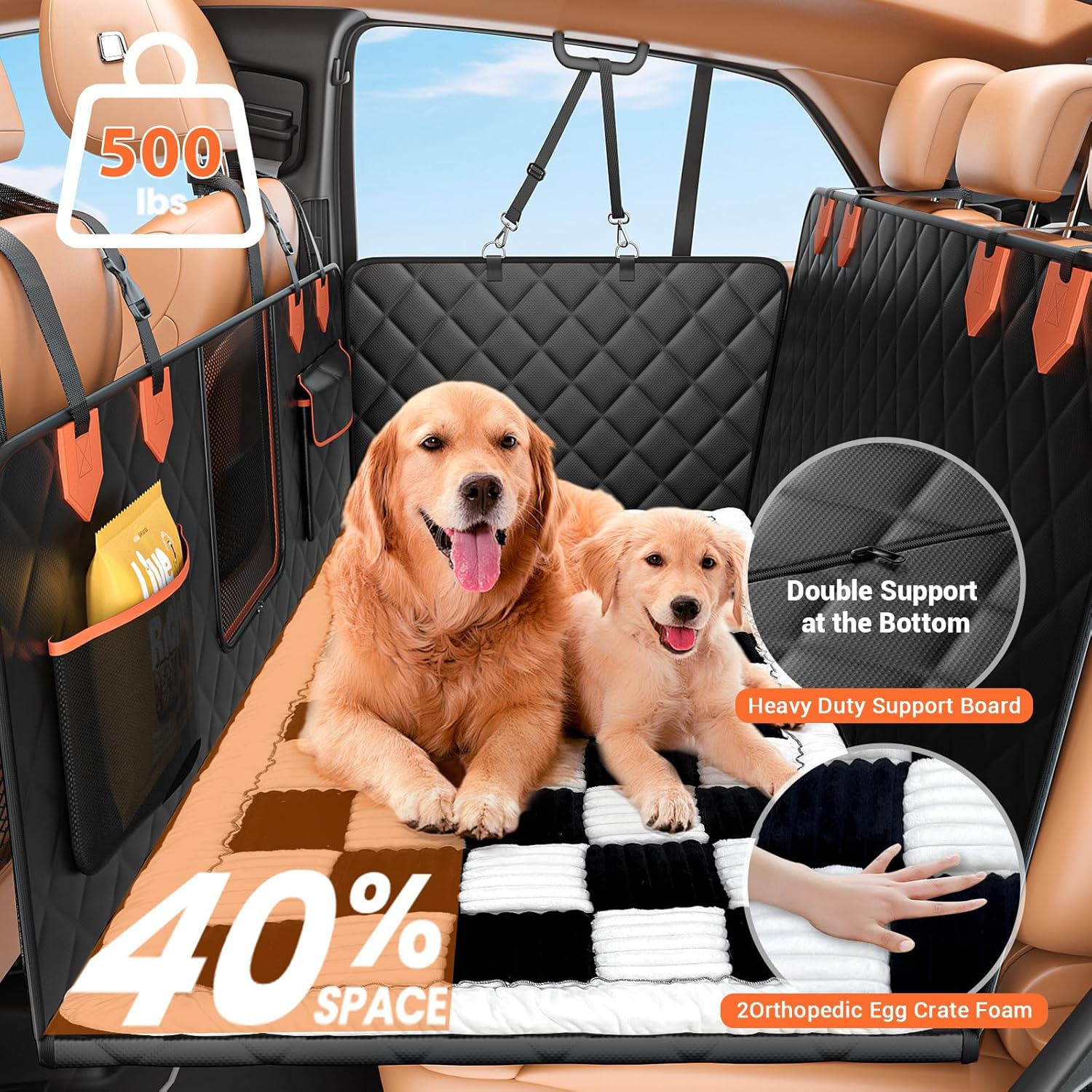 - 【EXPANDED BACK SEAT PLAY AREA】 Constructed with tear-resistant 600D Oxford fabric, our cover stretches across the entire rear floorboard, filling the footwell gap and connecting seamlessly to the back of the front seats. This design provides your dog with a larger, flat lounging and activity area, so they can relax or stretch out safely during long drives.