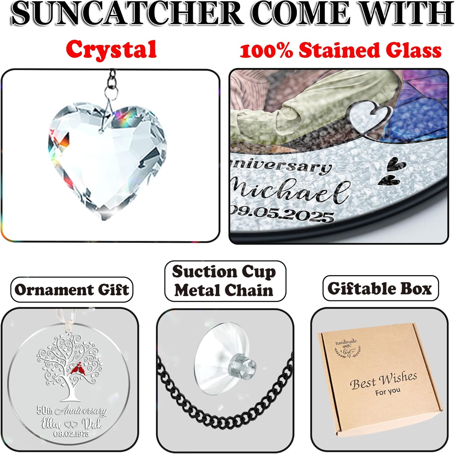 - Anniversary Gift Set for Couple: This thoughtful package includes a custom stained glass suncatcher and matching Tree of Life acrylic Ornament, both personalized with names and date. Features a sturdy metal chain, suction cup for easy hanging, and a 1.5" heart crystal that casts sparkling rainbows.
