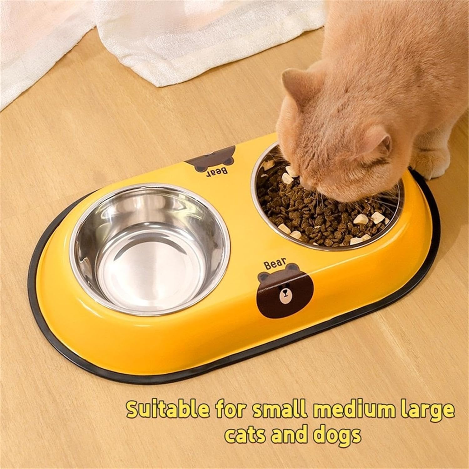 - DUAL BOWL DESIGN: Features two stainless steel bowls perfect for serving both food and water simultaneously, set in a stylish yellow base with cute bear decoration