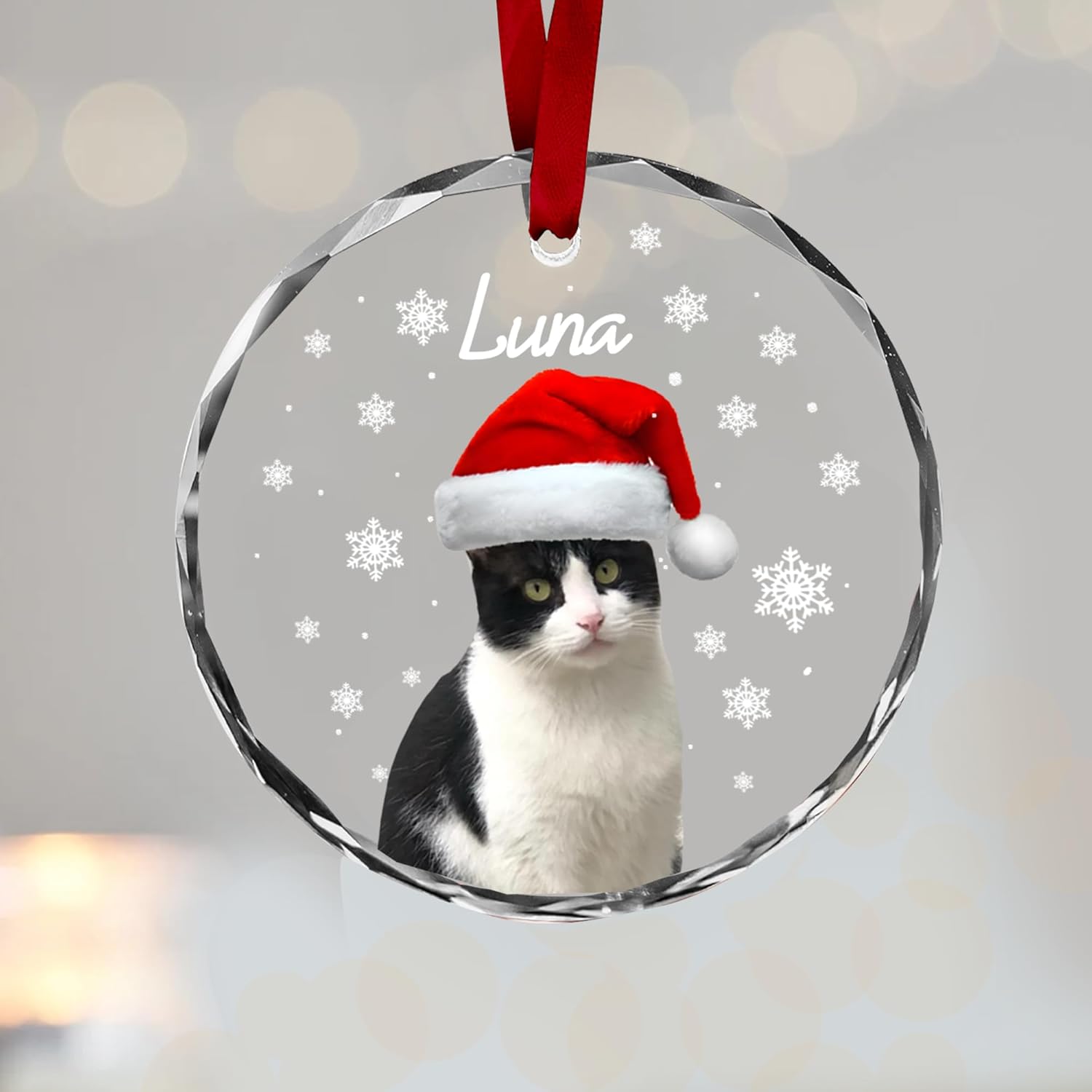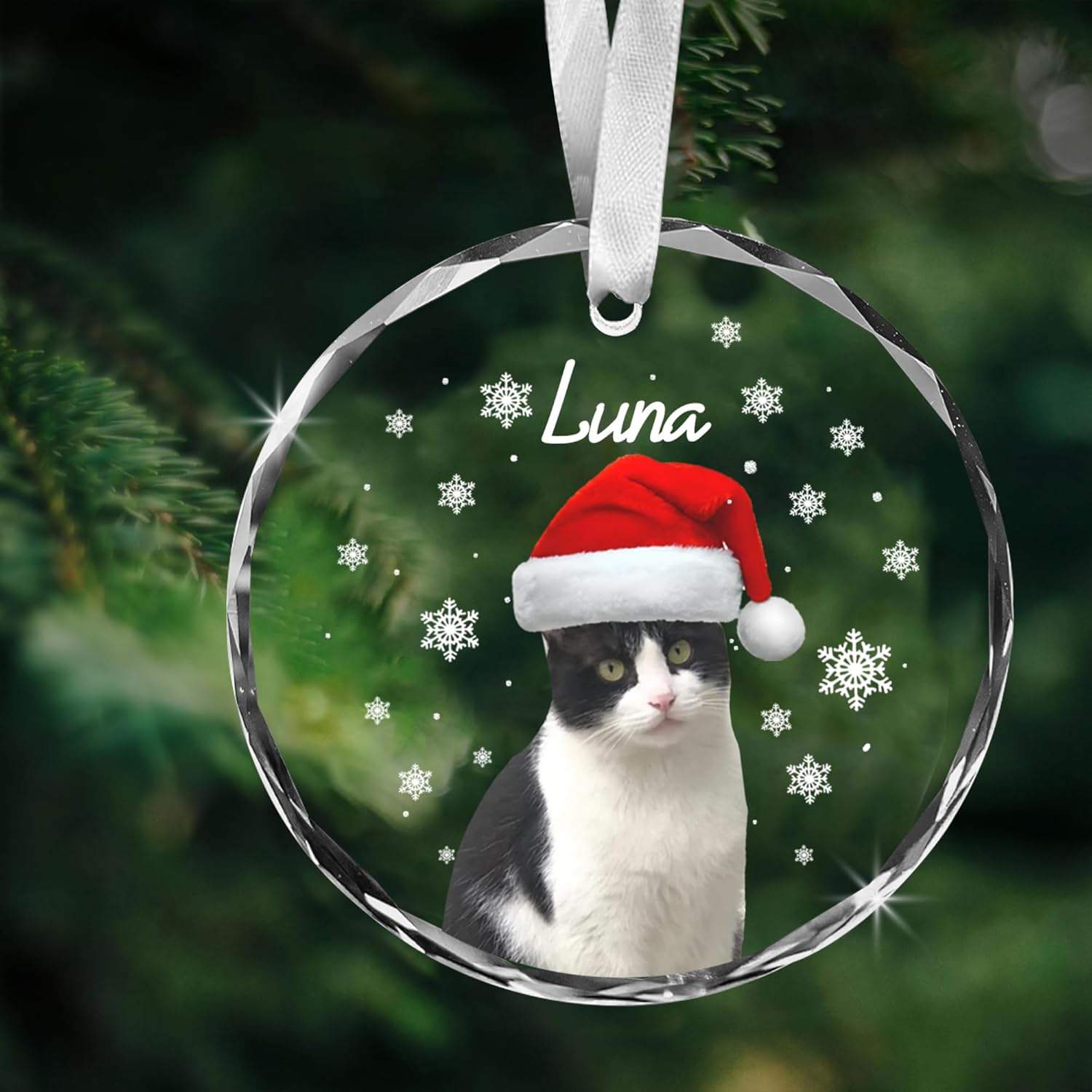- This personalized cat Christmas ornament features your pet wearing a cute Santa hat, surrounded by delicate snowflakes, making it a delightful and funny addition to your holiday decorations. Celebrate your feline friend with a unique keepsake that brings joy and warmth to your Christmas tree year after year.