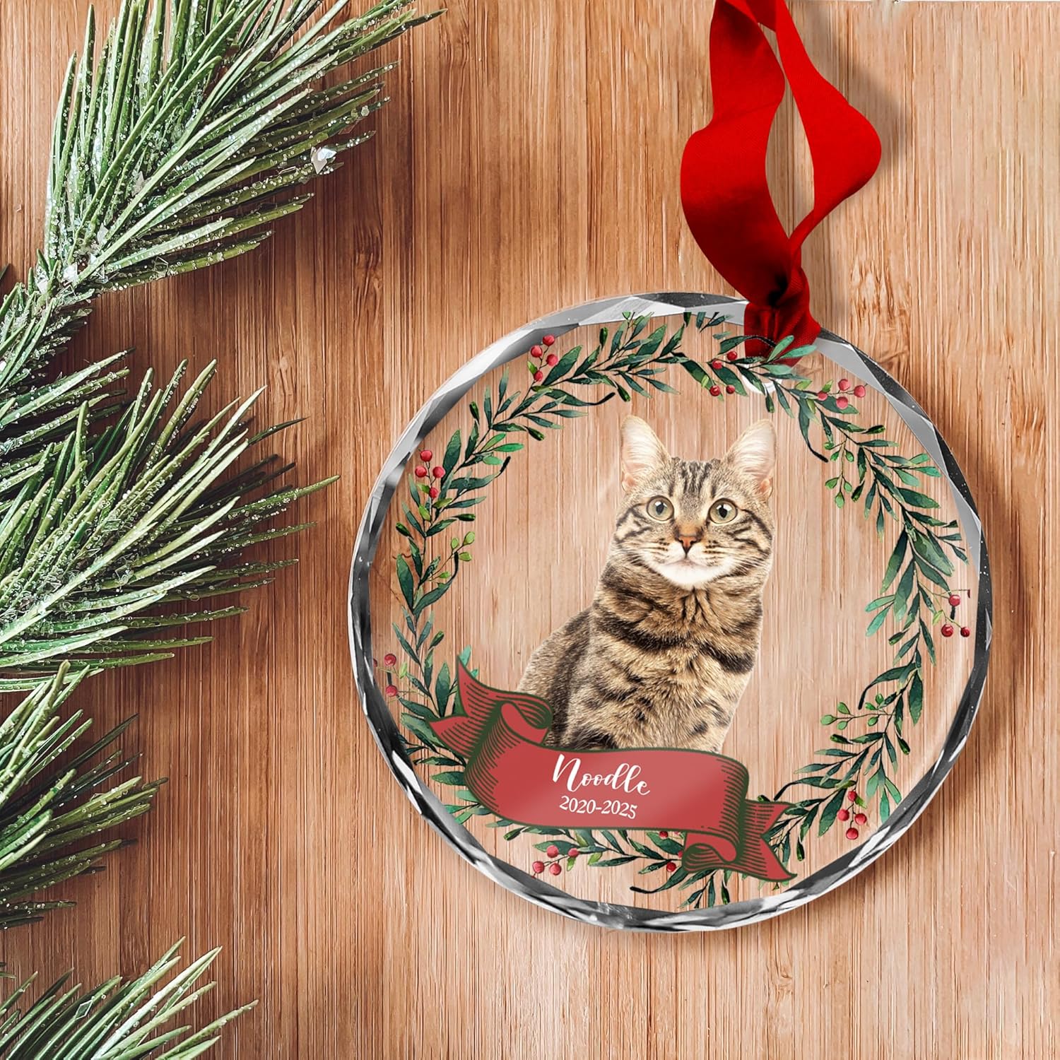 - This cat ornament memorial design features a festive Christmas wreath surrounding a photo of your beloved pet, paired with a personalized red ribbon showing their name and years. It’s a heartfelt tribute for anyone who has lost a cherished feline companion, blending holiday warmth with remembrance.