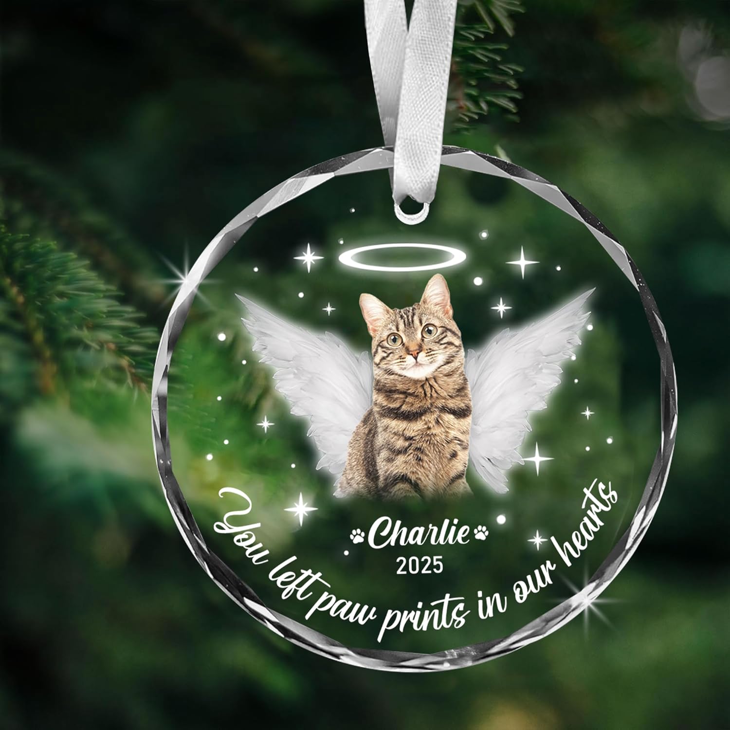 Personalized Cat Memorial Ornament, Pet Loss, Angel Keepsake for Cat Lovers, Custom Photo Glass Ornament – You Left Paw Prints in Our Hearts