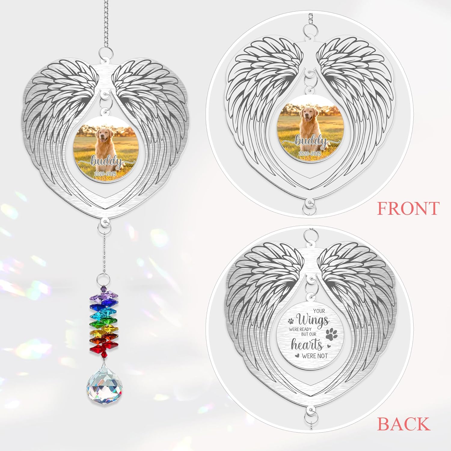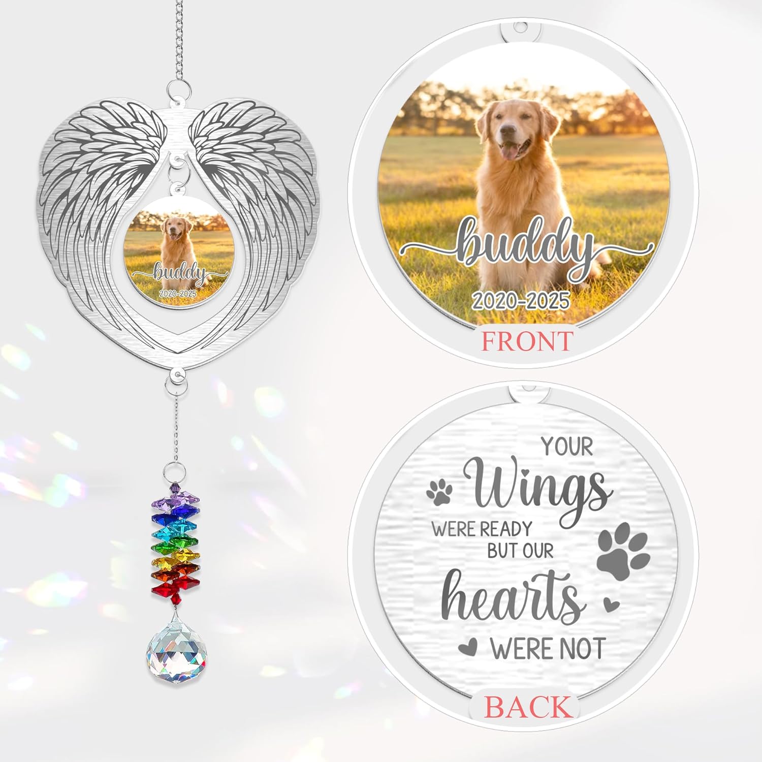 - Featuring a heartfelt angel wings frame and a round disc engraved with “Your wings were ready but our hearts were not,” this dog suncatcher memorial is a gentle tribute for any pet parent grieving the loss of their beloved dog. It symbolizes eternal love and connection across the Rainbow Bridge.