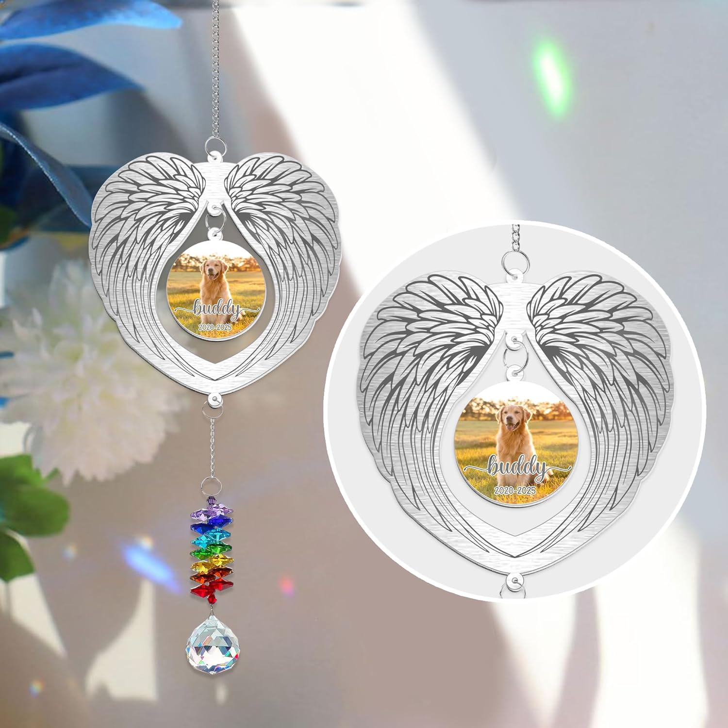 Personalized Dog Memorial Suncatcher, Pet Loss Ornament for Dog Owner - Angel Wings Frame with Custom Photo & Years - Rainbow Crystal Remembrance Gift for Christmas
