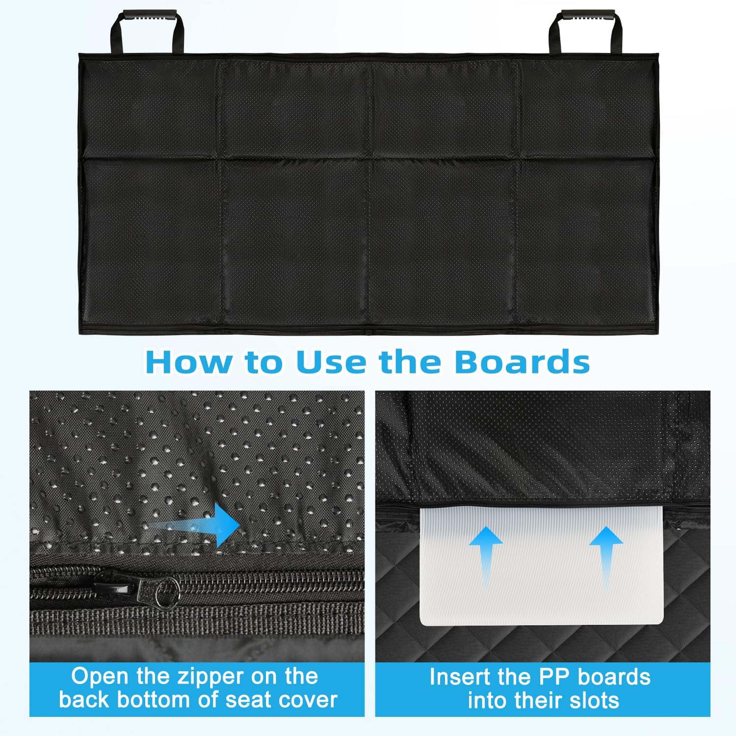- ✅【Easy Installation】Just open the pet car seat bed, Insert the seat cushion anchor into the rear seat, 4 sets of adjustable clips that attach around the headrest in the front and the back to fix cover, fasten the 2 door flap straps through the armrest and then the back seat turns into a large bed for your dogs