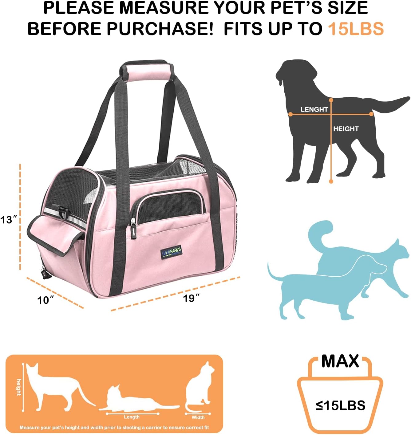 - WHATS MORE: This Pet Carrier comes with a removable pad for comfort and easy cleaning. Storage space so you can treat your pet while on the go. Adjustable shoulder strap so you can adjust to your perfect fit. This carrier is great for AIRLINE TRAVEL designed to fit under your seat