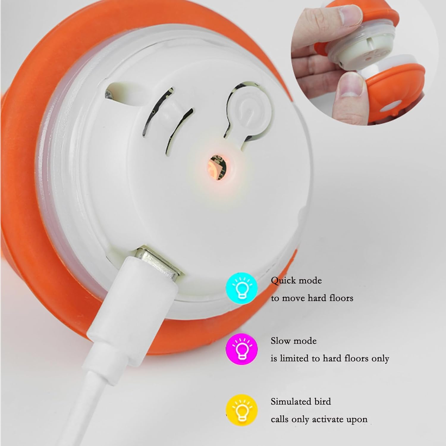 - squeaky dog toy:It's voice on by default. Chirping voice from dog toys for small dogs will make more attractive to dogs. If you need quiet, quickly press twice the power button will make voice off.interactive dog toys for large dogs, puppy toys to keep them busy, interactive cat toy, interactive cat ball