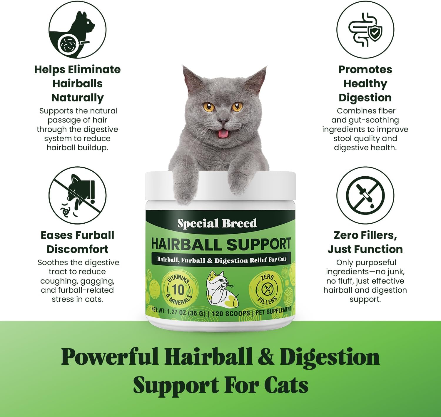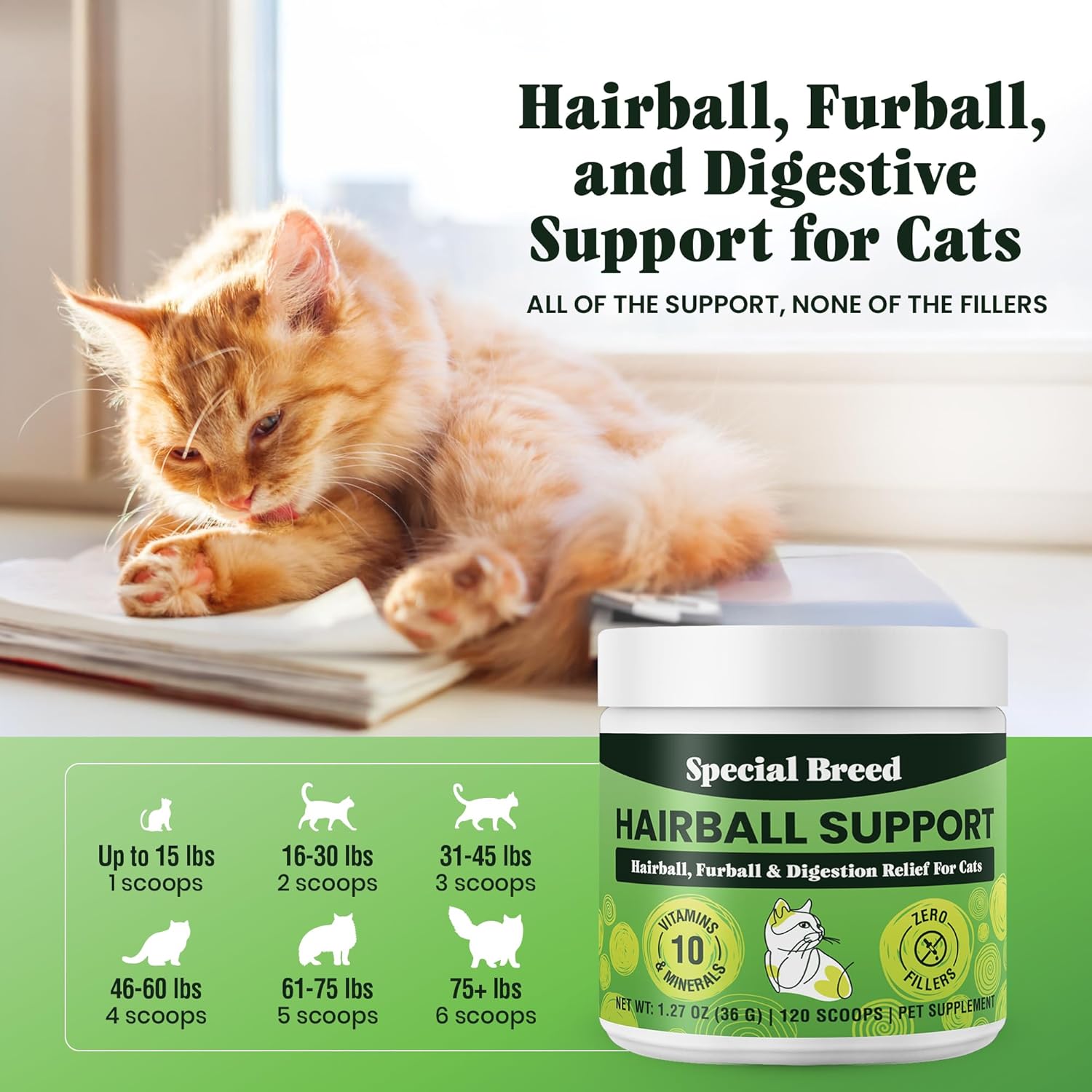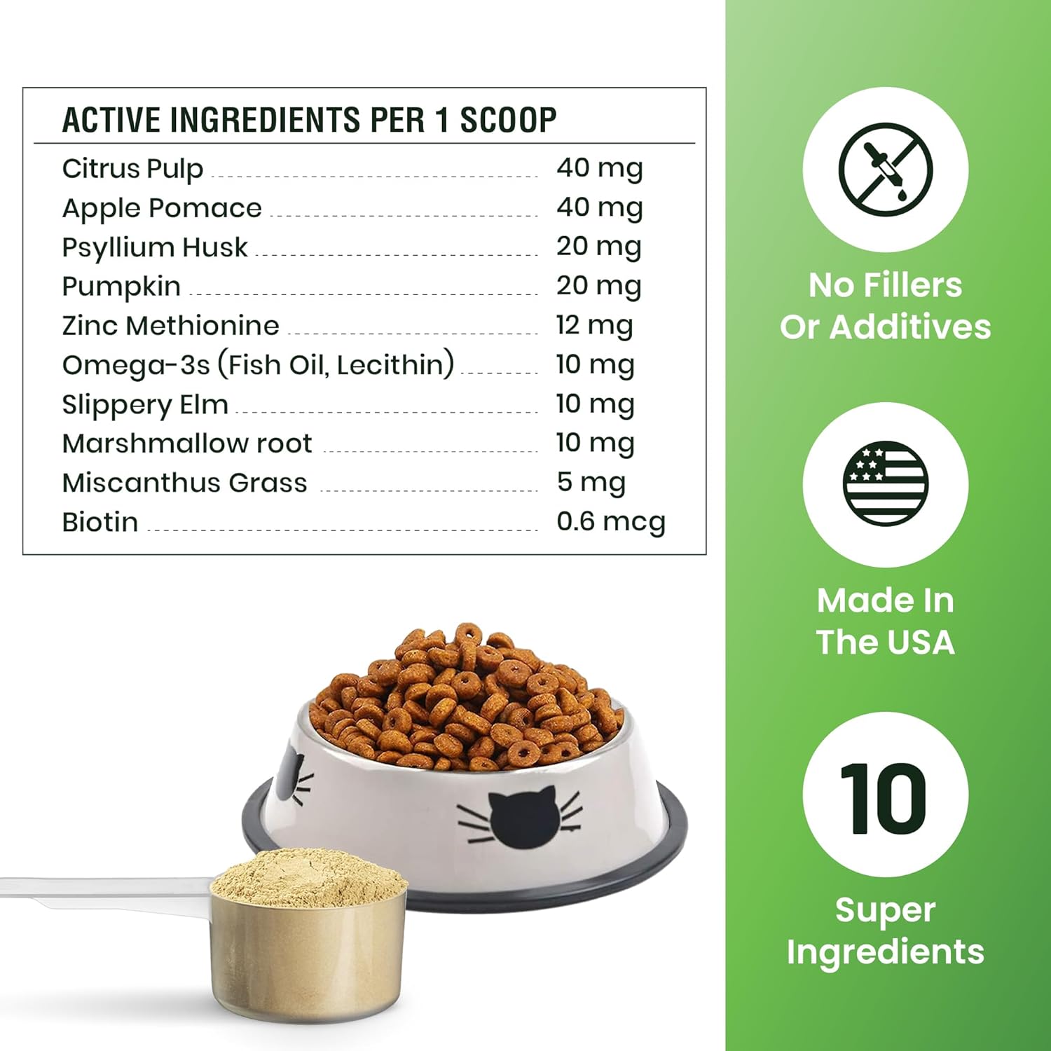 Hairball Support for Cats - 10 Super Ingredients for Hairball Relief, Digestive Support & Healthy Skin - No Fillers - Psyllium, Pumpkin, Omega-3s & More - 120 Scoops